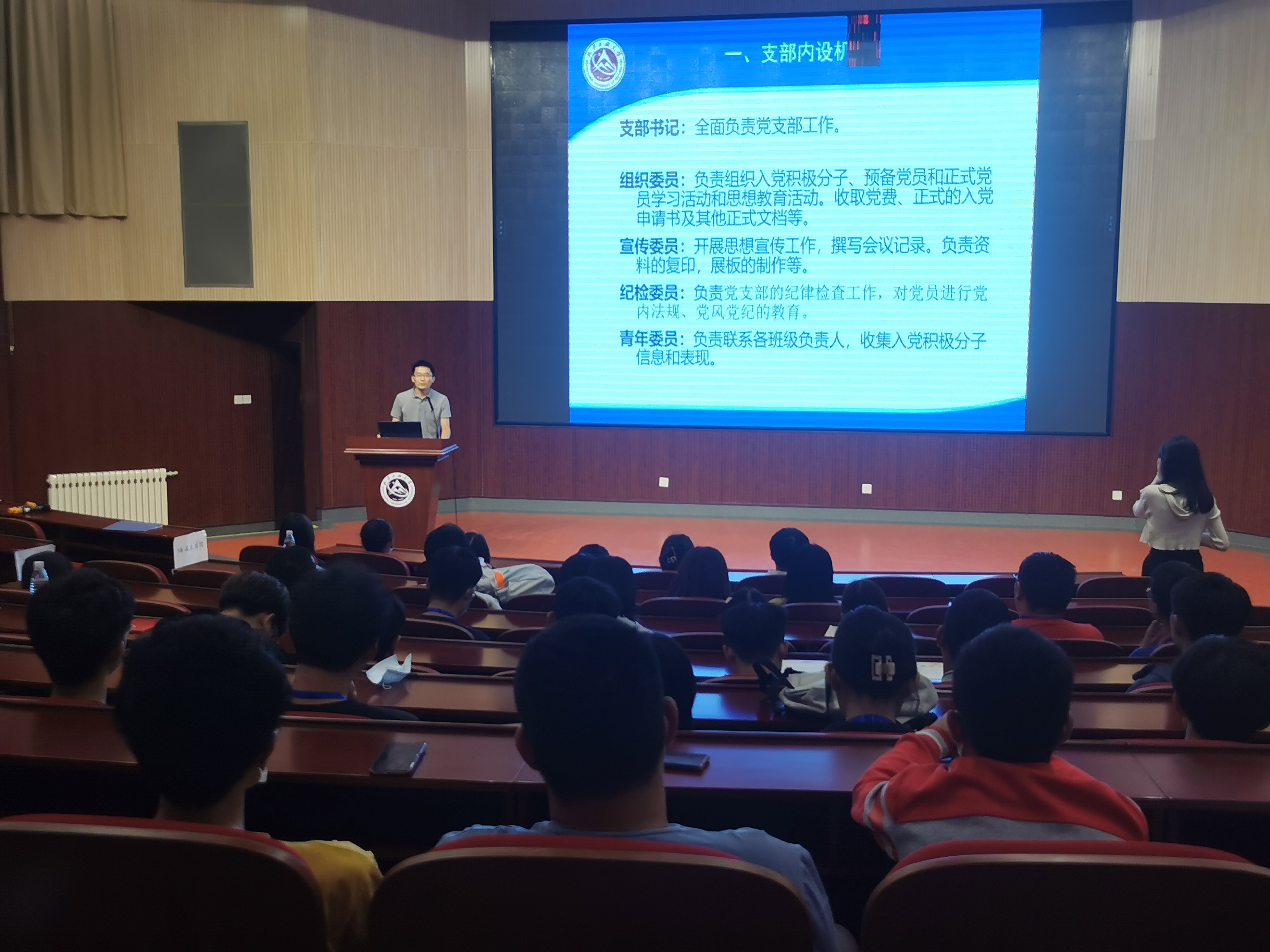 随后,数学本科生党支部书记徐鑫老师详细介绍了入党的具体流程,主要讲解了支部机构、入党流程和具体做法,特别强调了同学们撰写入党申请书、思想汇报的注意事项,以及积极分子培养、预备党员发展等方面的具体要求,并现场解答了同学们的问题。