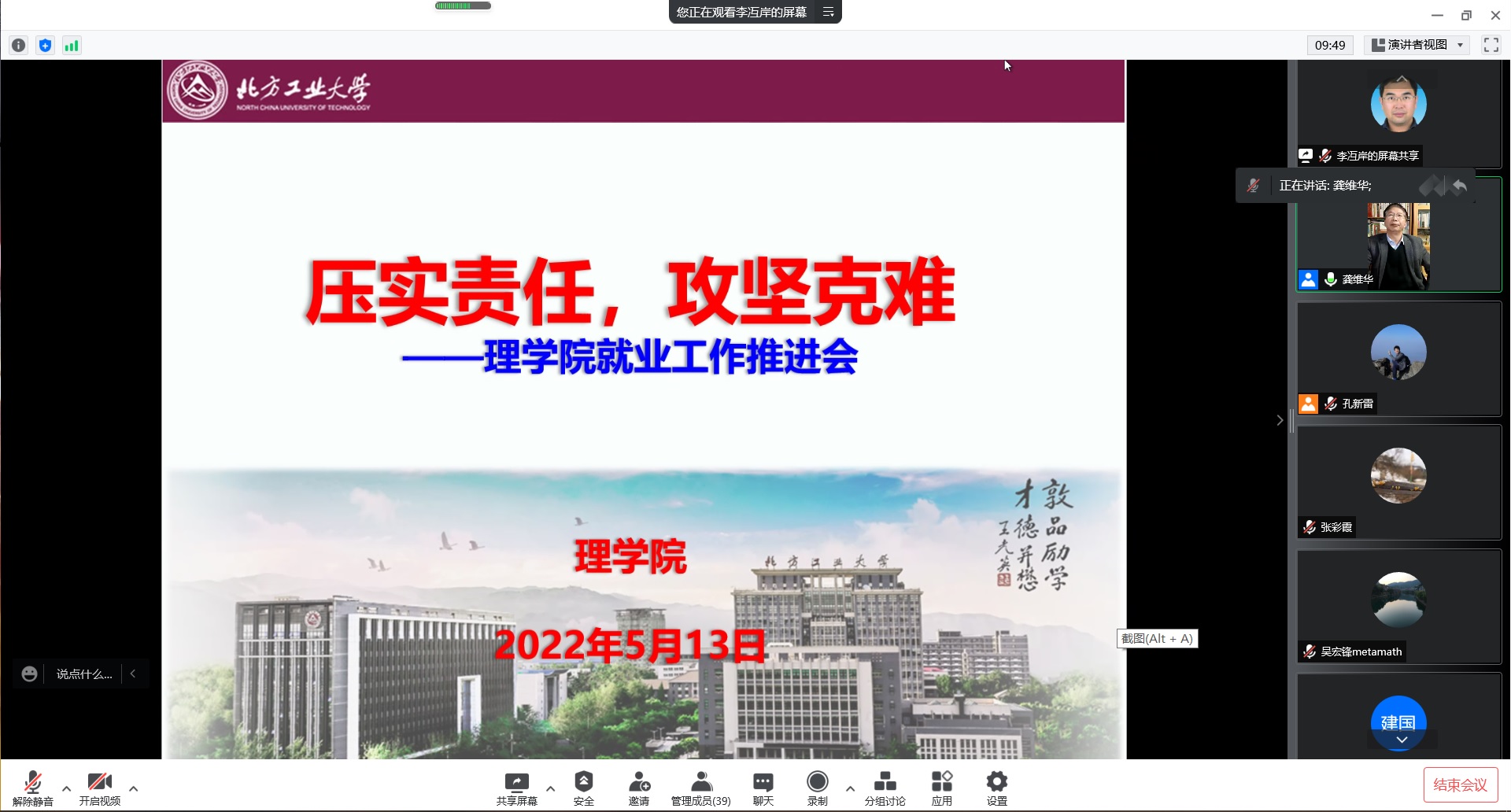 5月13日晚,365best体育官网登录召开2022届毕业生就业工作线上推进会,公司班子成员、各系主任、责任教授、公司全体研究生导师、数学系和统计系全体教师、办公室全体成员参加会议。会议由党委副书记李冱岸主持。