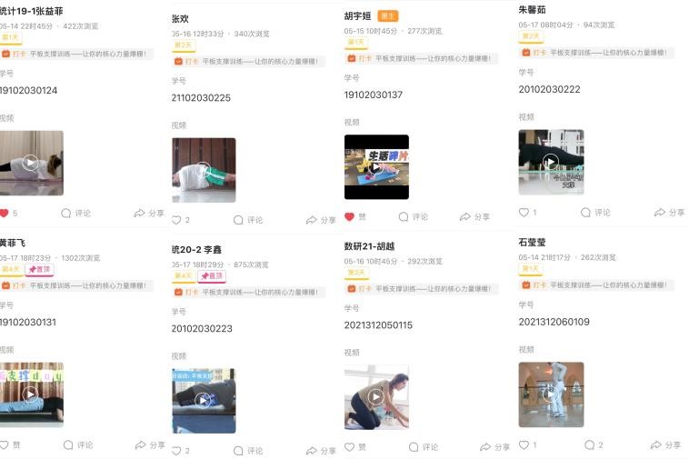 统19-1的张益菲同学说到,在疫情的影响下,我们以居家学习的方式开启了本学期的学习生活。因此,我十分感谢本次线上运动会给予了我与分隔异地的同学们能够一起大汗淋漓的机会。快乐的生活,需要用健康的身体去享受,幸福的感觉,需要用健康的心态去体会,美好的一切源于健康。无论是否在校,我们都需要重视个人的健康问题。最后,我希望能够呼吁更多的同学来加入到热爱运动的集体中,让我们一起互相监督,互相鼓励,在学习之余,保证自己有一个健康的身体,劳逸结合,让学习更佳高效。信19-1班的张喜同学说到,天行健,君子以自强不息;地势坤,君子以厚德载物。身体素质是生活的本钱,通过这次线上打卡的机会,更加促进我体育锻炼的积极性,让我们的身体更加刚强劲健。在疫情肆虑的现如今,有一身健壮的身体素质,是必不可少的。希望大家多多参与到体育锻炼中,少年强,则中国强。统19-1的胡宇姮同学说到,加强体育锻炼,是疫情生活中的重要之重。我们居家锻炼身体,增强体质,提高防疫抵抗力,有好的抵抗力才能抵御病毒!统21-2的侯思嘉同学认为在这活力四射的五月,公司联合各个公司组织的这次运动会帮助我们更好的养成规律运动的好习惯,促进了同学们积极参与体育锻炼。原本我们本应齐聚运动场努力拼搏,加油呐喊,乐享运动魅力。不料被新冠疫情阻挡了脚步。所以本次的线上运动会就显得尤为重要,可以促进我们提高身体素质,共同抵抗疫情。在这次线上运动会中,平板支撑运动十分精彩,这项活动不仅锻炼了我们坚持不懈的决心而且提高了我们的毅力。信21-1的黄馨瑶同学认为疫情期间时间比较充裕,参加这次的平板支撑活动也让我重拾了对运动的热情,并且在比赛中也能发掘自己在挑战不同运动时潜力,是一次非常难得的挑战自己的机会。且适当运动也是一个舒缓压力的方式,在疫情的影响下适当的锻炼能够增强自己的免疫力也能让身心放松,打卡活动是一个很好的激励自己的机会。同时这次活动也使我对运动又有了新的认知和收获,相信我今后也会坚持下去长期锻炼,精益求精的提高自己的运动技能。
