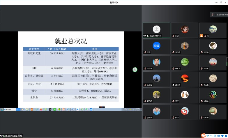 统计系主任刘喜波、责任教授徐礼文、班导师陈云和数学系副主任郑权、责任教授宋瑞霞等老师各自用翔实的数据汇报了每名本科生和研究生当前就业进展动态,每名研究生导师、论文指导老师对所带员工在指导学业的同时,是如何帮扶指导员工就业及帮扶进展、遇到的困难、下步举措等内容。