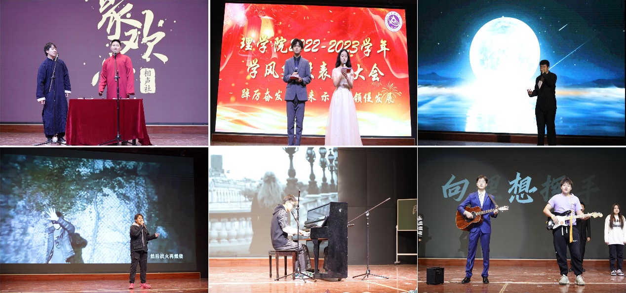 文艺汇演环节中,同学们尽显才艺。张珺涵同学用深沉浑厚的歌声演唱歌曲《玫瑰》,带领我们回忆青春;统23-1班及小导的话剧《新青年觉醒抗争》将同学们的思绪带回到那个交织着汗水血水与泪水的觉醒年代,激发同学们满腔的爱国热情;范佳琪同学和许澜馨同学同台演唱歌曲《裹着心的光》,婉转动听的歌声,让同学们的心中充满力量;统23-2班同学们带来合唱《有何不可》,刘欣邦同学的独舞《默》,让我们静心倾听内心的声音。