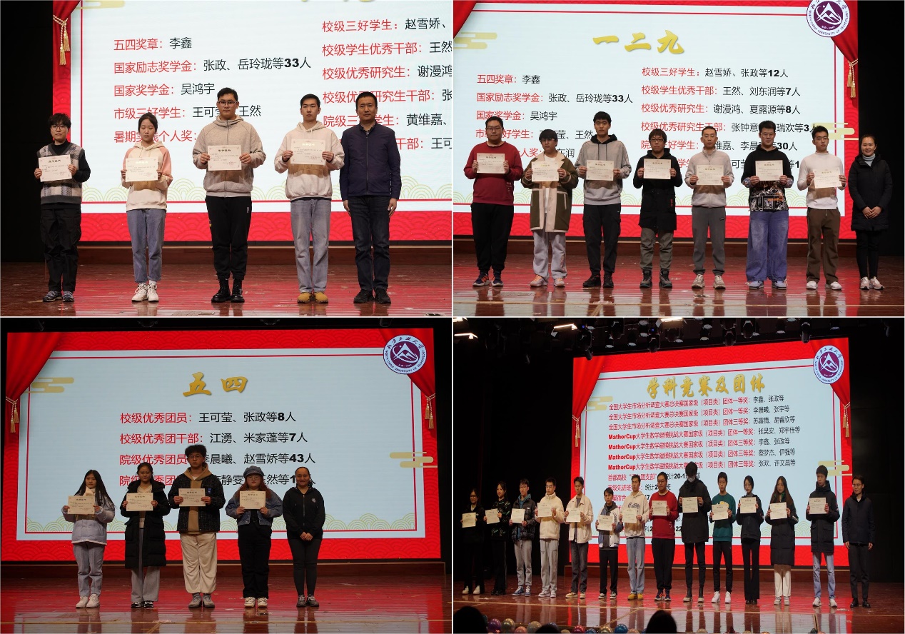 颁奖环节中,贺映勇为获得国家奖学金、国家励志奖学金、市级三好员工、公司五四青年奖章的员工代表颁奖;夏丹梅为获得暑期社会实践先进个人、校院两级三好员工、校院两级优秀员工干部、校级优秀研究生干部、校级优秀研究生的员工代表颁奖;曹琪为获得校级院级优秀团员和优秀团干部的员工代表颁奖;熊敏为获得重大竞赛获奖、首都高校“活力团支部”、市级先进班集体、校级优秀班级、校级优秀团支部、院级优秀班级和院级五星宿舍的员工代表颁奖。