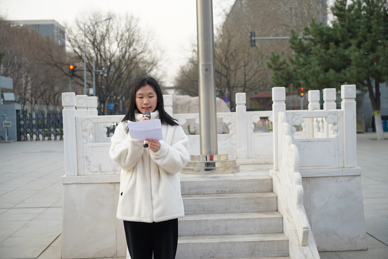 统23-1班的苏雨珊同学进行国旗下演讲。她倡议同学们要以雷锋精神为榜样,将雷锋精神融入到日常的学习与生活当中,为社会的发展和进步注入青春动能。