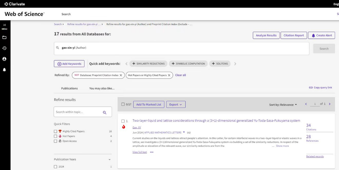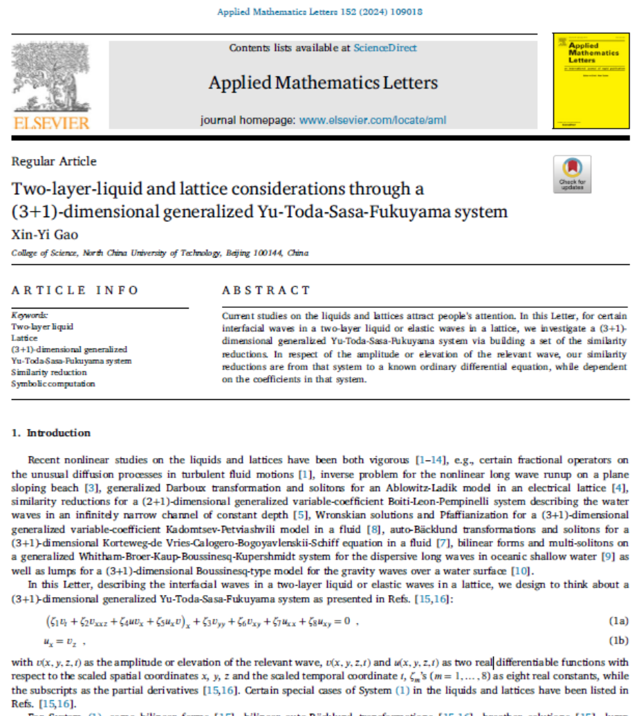 近日,公司365best体育官网登录教师高心怡在Applied Mathematics Letters(应用数学快报)发表的标题为Two-layer-liquid and lattice considerations through a (3+1)-dimensional generalized Yu-Toda-Sasa-Fukuyama system[通过(3+1)维广义Yu-Toda-Sasa-Fukuyama系统考察双层液体和晶格]的文章入选“ESI热点论文”。