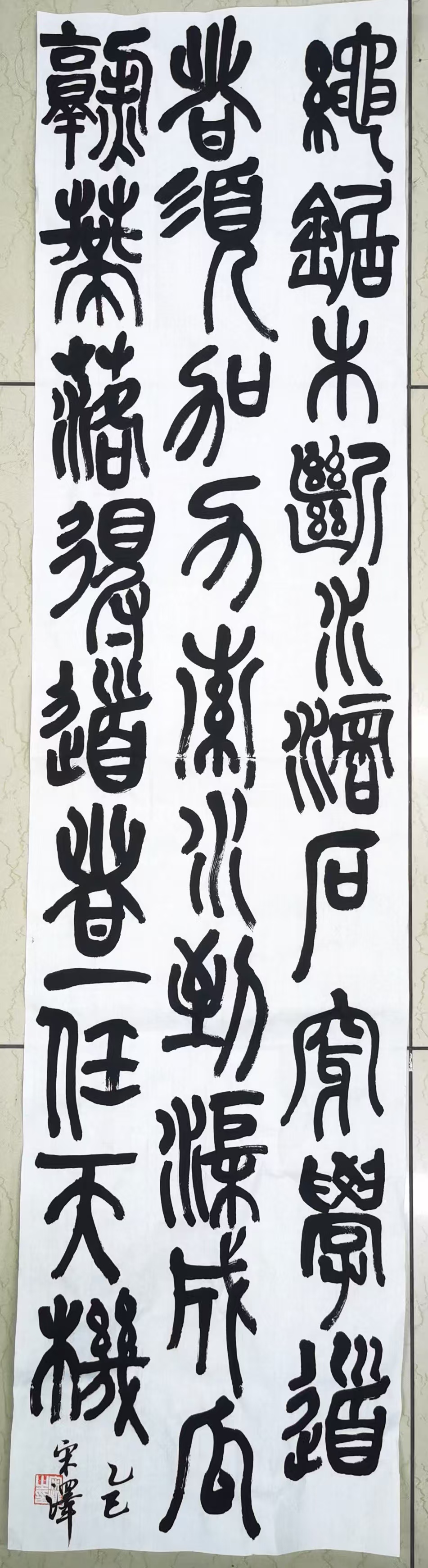 书法作品展示活动中,同学们从红色书籍中汲取灵感,以书法为载体,表达对红色经典的理解和敬意。统23级宋泽同学所作的拟吴昌硕笔意的小篆条幅,书写内容为“绳锯木断,水滴石穿,学道者须加力索;水到渠成,瓜熟蒂落,得道者一任天机”,借古人对求道问道的思考,启示当下的读书与学习。