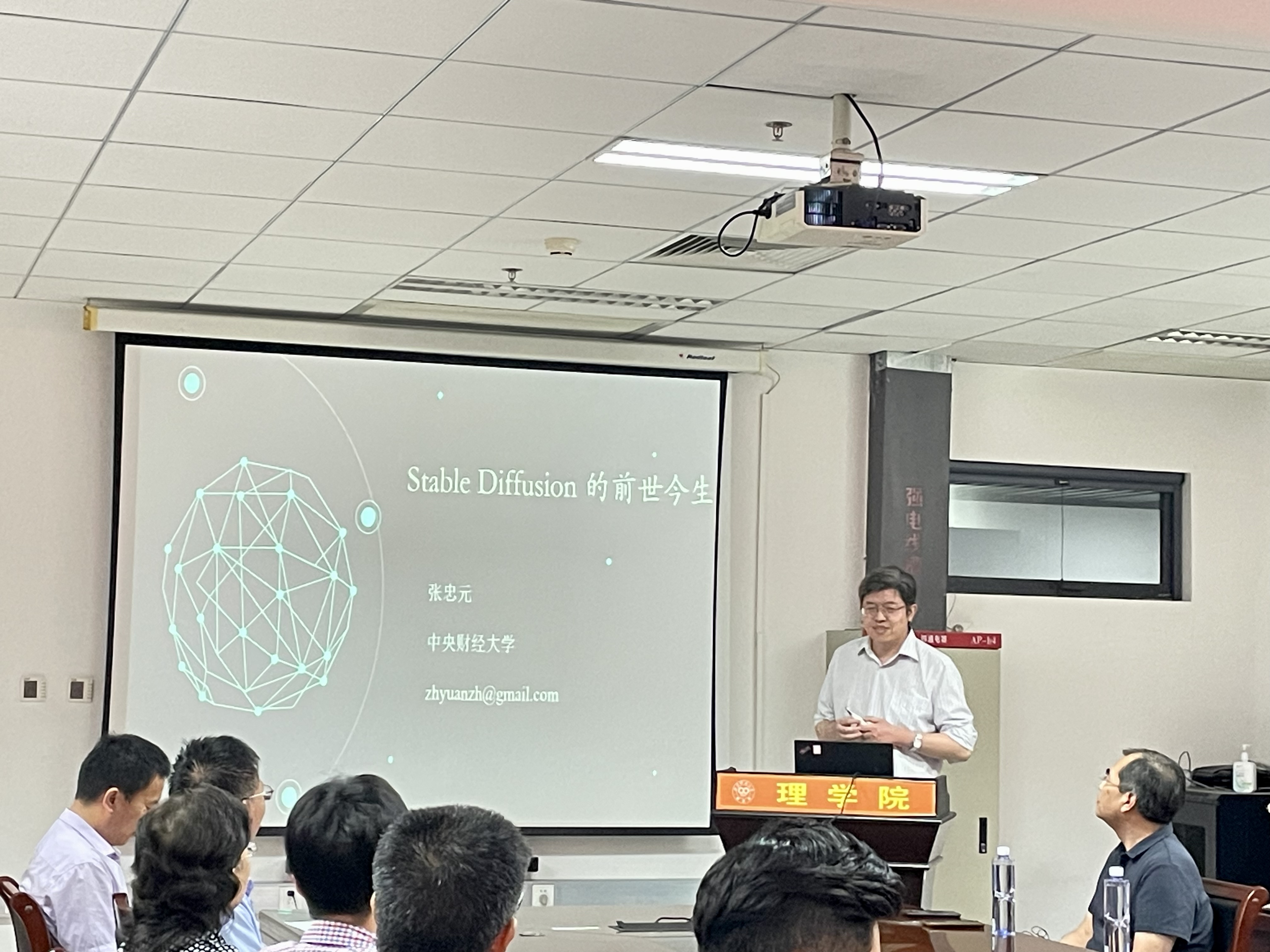中央财经大学统计与数学公司张忠元教授做了题为“stable Diffusion的前世今生”的学术报告。张教授介绍了生成模型的基本原理和常见方法,包括变分自解码器、生成对抗网络和扩散模型等,这些方法可以用来建模和生成各种类型的数据,包括从简单的图像和文本到复杂的时间序列和网络结构等。最后介绍了生成模型的挑战和未来发展方向。