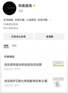 她在几年前创立了属于自己的公众号“异面直线”以此来分享那些让她夜不能寐的有趣题目,探讨那些令人拍案叫绝的解题方法。每一篇推送,都是她对数学之美的一次新发现和一次新互动。截至目前,她的公众号已有200+的用户关注,总阅读量突破五万+,赞赏金额累计600+。这些数字不仅是对她的肯定,也是她继续前进的动力。