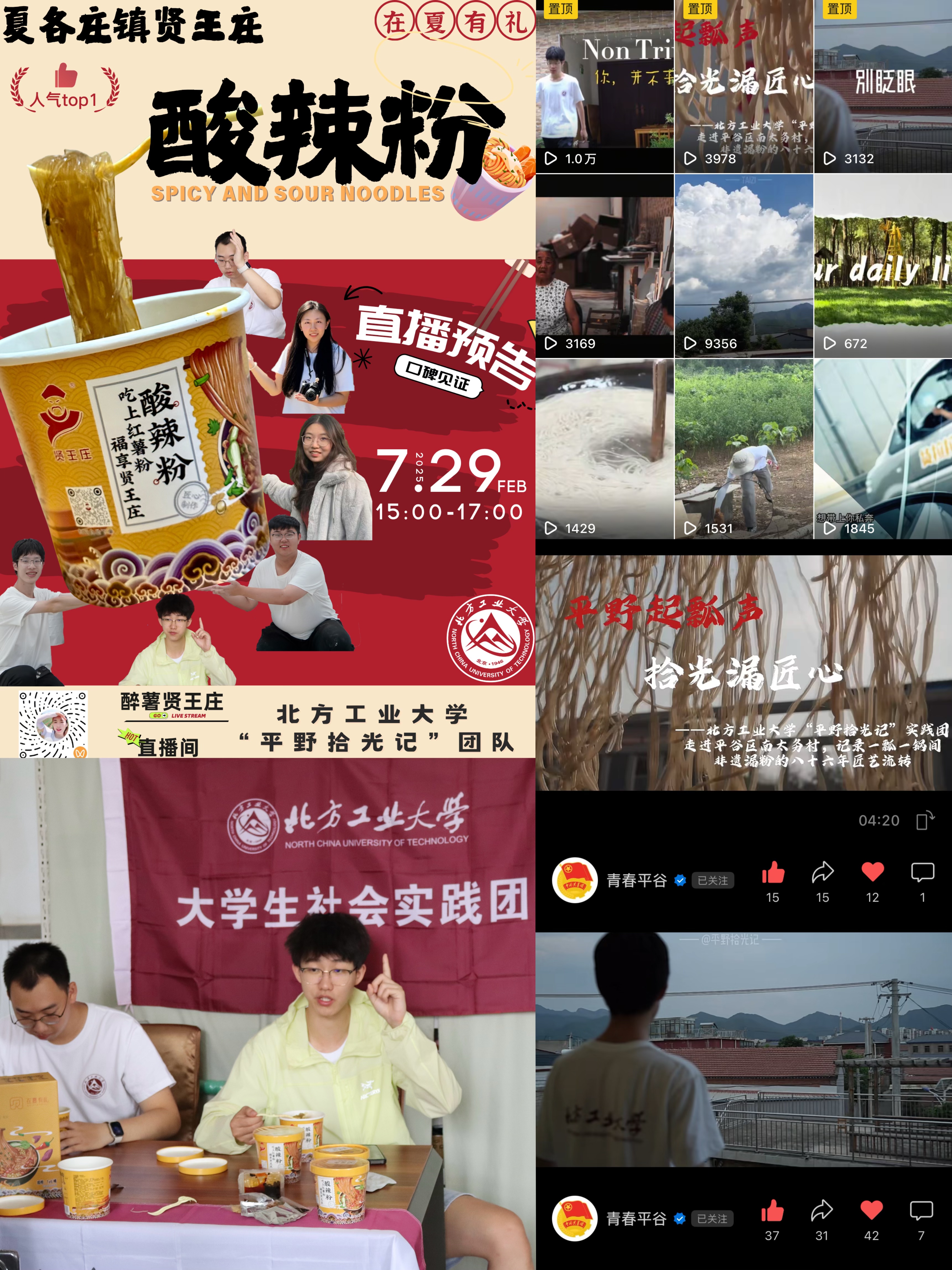 双线发力新媒体推广,实践队开展“助农实战”行动。一方面,开展公益助农直播日活动,队员进行“沉浸式吃播”并播放芡糊调制、手工漏粉等核心工艺视频,近两小时直播吸引626人次观看,收获3.1万点赞,有效提升“醉薯贤王庄”品牌热度;另一方面,精心运营《平野拾光记》抖音号,累计发布9条视频,其中2条获“青春平谷”视频号转发,作品《平野起瓢声,拾光漏匠心》详实记录非遗漏粉86年匠艺流转。截至目前,抖音视频总播放量突破2.27万次。团队通过直播带货与短视频传播的实战组合拳,显著扩大了非遗漏粉的知晓度与品牌影响力,为乡村产业注入新媒体活力。